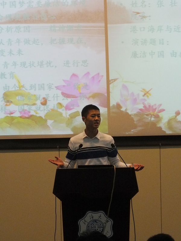 比赛于9:30准时开始,选手们一一登台演讲,表达对于廉洁的理解与期望。张壮同学作为第15号选手登台,在分析了严峻的社会现实后,着重从青年的角度展开论述。他分析深刻,言语有力,时而使在场的观众陷入深思,时而又用通俗风趣的比喻让大家开怀大笑,演讲结束后,赢得了台下一片掌声。所有选手结束演讲后,评委老师做了简要点评。