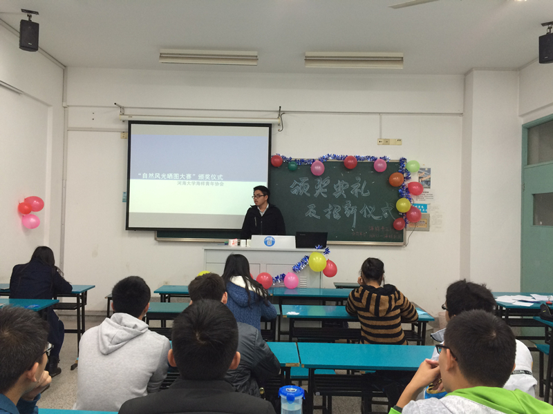 14级海洋班新生耿伟伟与王进主持本次颁奖典礼。开场两位主持人便幽默风趣的总结了本次活动,本次比赛(微社区)高达26000多次的访问量更是让大家一阵惊呼。接着,副会长张冬娜介绍了社团的现状并播放了一段“快闪”活动的视频,王进给大家展示了一段高大上的动画式PPT,配合他的精彩演讲,让大家进一步了解了海样青年协会。颁奖仪式后增加的游戏环节:捏爆气球抽大奖和截图猜电影更是得到了在场所有同学的欢迎和一致好评。最后,会长金晨成做了总结发言,金晨成对本次出席海协晒图大赛颁奖仪式的同学表示衷心的感谢,并承诺将会在今后举办更多有趣的活动,号召有兴趣的同学及时关注并加入我们,当场又有9名同学响应号召加入了海协。