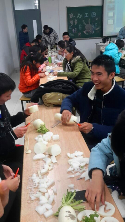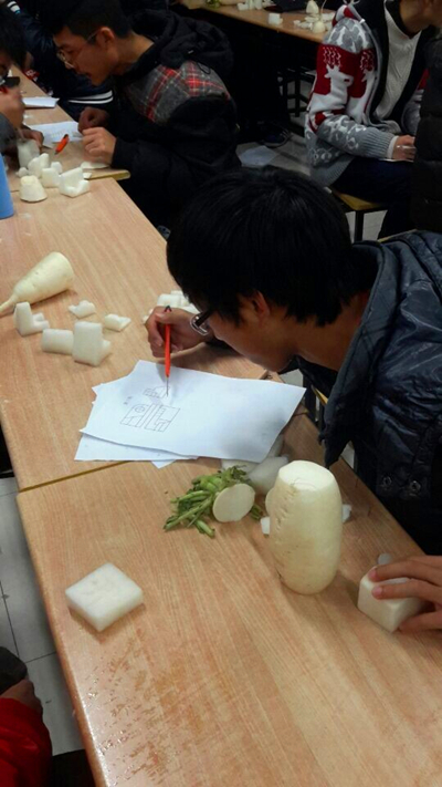 “同学们在这次活动中收获的不仅是欢乐,更获得了学习工图的兴趣。”在季超老师做完活动的总结后,“玩转工图”之萝卜工程师制模工图比赛在2014年12月8日晚画上了圆满的句号。本次”玩转工图”活动由14级港航三班班委承办,并在继承上届学长们好想法的同时大胆进行改革,采用了更易操作且趣味性更足的萝卜作为材料,并在赛制上广泛采取多方意见,最终形成了比赛当天的壮观场景。虽然形式有所变化,但目的仍是明确的,即让大家在欢乐的玩耍中找到学习工图的兴趣和方法,让大家不再惧怕所谓难学的工程制图。