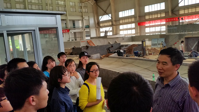 随后,蔡辉老师带领同学们参观了江宁校区的港航实验室。蔡老师首先向同学们介绍了大型不规则波浪制造机,详细地讲解了其动力系统及其利用相位差制造不同方向波浪的原理,以及消浪墙的原理作用。接着,蔡老师又介绍了正在修建的河床和水电站模型,引起了同学们的极大兴趣。有同学就创新创训实验向蔡老师提出了问题,蔡老师为其一一解答,使得同学们对专业知识有了更加具体的了解。
