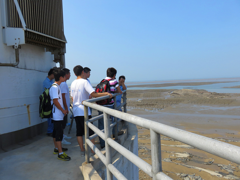 下午一点,队员们在实践团指导老师潘毅老师和研究风能资源的郑老师的带领下,来到了福清市的一处海上风电场,参观了其中潮间带的一座重力式基础海上风机。经现场工作人员介绍,该海上风机高达100米,叶片直径115米,质量达到五百多吨,其二百五十吨重的钢混基础每天承受着潮汐的冲击与冲刷。现场的设计人员向队员们讲解了许多关于基础防护、防腐蚀方面的知识。随后,实践团奔赴福清对岸的平潭岛,准备第三天的实践活动。