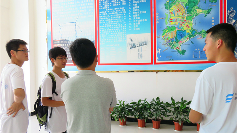 7月14日上午八点,实践团来到中闽(平潭)风电有限公司的平潭清峰风电场。四周蜿蜒的山脉上伫立着一座座缓缓旋转着的风机,蔚为壮观。风电场的甄主任给队员们介绍了平潭风能资源的大致分布,由于狭管效应与亚热带季风气候,福建省拥有丰富的风能资源,而风电场的布置也是经过了长时间的测量才确定的,这让队员们意识到要更加珍惜现有的资源,同时要努力学习专业知识,为新能源的开发贡献自己的一份力量。介绍完毕,甄主任又带队员们来到了升压台的中控室,现场观察工作人员对风机运转进行风速、风向和功率的监测。离开了中控室,穿过蜿蜒的山路,队员们来到了24号风机处,这里数十台风机尽收眼底,绵延的山峰与碧蓝的海湾交织如画,旋转的风机如同时代的齿轮,推动着新能源技术的不断发展、人类社会的不断进步。
