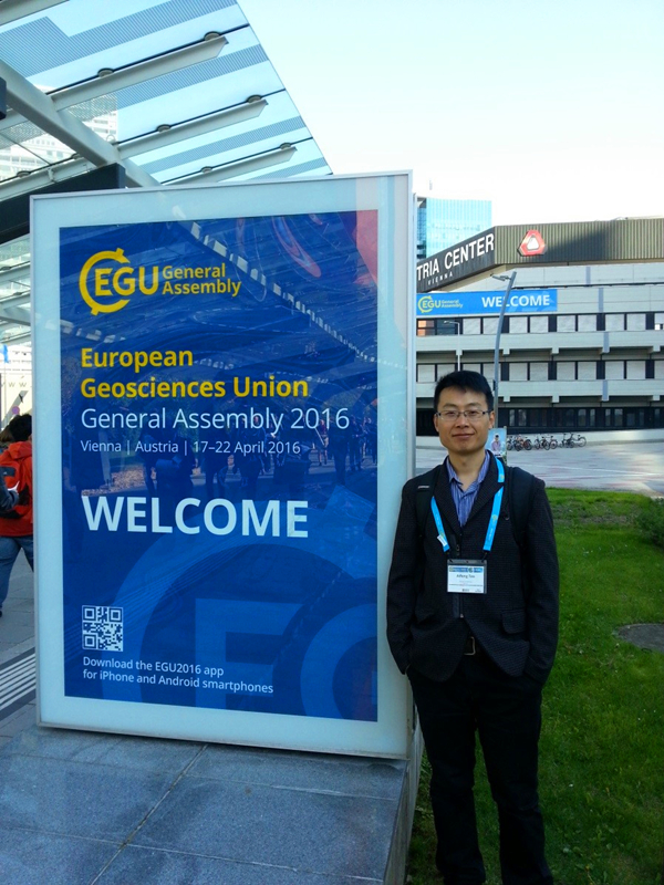 2016年4月19日至23日期间,博彩网 陶爱峰副教授参加了在奥地利维也纳举办的EGU(European Geosciences Union)2016年国际学术年会。会议期间,陶爱峰副教授在NH5.2自然灾害分会场的极端海洋与非线性波浪方向专题组做了题为“Preliminary investigation on the relation between maximum wave height and wave spectra”的学术报告,并作为优秀学生海报和演讲奖(Outstanding Student Poster and PICO (OSPP) Award)的评选专家参与了该奖的评选活动。