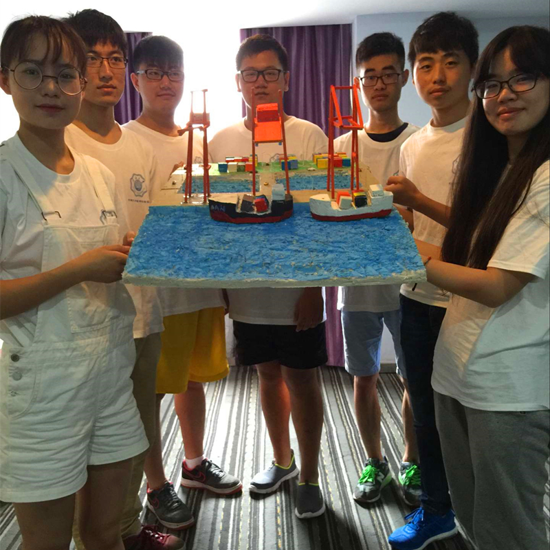 7月10日,工程部部长带领实践团参观江海港区,以正在卸载硫磺的船只为例,展示散货装卸的过程。回到酒店后,队员们根据这两天的所见所感制作理想港口模型。队员们带着模型制作经验,参照在历史陈列室见到的港口示例模型开始了图纸设计。时间在专注里走得飞快,这个下午,队员们用泡沫塑料板完成了港口模型大部分零件形状的制作。集装箱和船只的数个模型错落有致地放在已挖成海床和海岸的大块泡沫塑料板旁;木条切剪成的各个小条也拼装搭建成了一个个起重机。