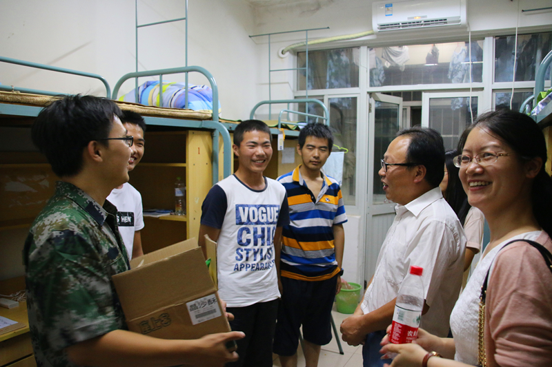 派送月饼活动于21点30分正式开始,首先派送的地点是16级女生宿舍。胡忠华书记,姜海霞副书记和辅导员季超老师带着精心准备的月饼逐一访问了各宿舍。胡书记亲切地问候了在异乡求学的学子们,一边分发月饼,一边询问起了学生的近况,军训期间的情况,对宿舍的意见等等。听到胡忠华书记能准确说出大多数同学的个人信息,同学们纷纷表示很感动,也感激学院领导对他们16级新生的关心和帮助。