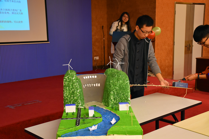 决赛开始,主持人介绍评委老师及决赛流程,选手们按照抽签顺序依次走上讲台,结合ppt介绍与实物模型展示,向评委们介绍模型的设计理念、制作过程和作品特色。“梦想工程师”们的“梦想模型”形式多样:局部的码头、大坝、船舶升降机;全景的海港、大坝;以低碳环保、生态和谐为主题的未来大港规划等等。其中,来自博彩网 同学制作的“低碳节能、梦筑绿港”模型演示出风力、潮汐为设备供电、使船体发出声音的过程。而大禹院的同学制作的空腹重力坝也很吸引评委的眼球,该组模型预设在河流湍急、河道狭窄以及山势险峻的恶劣地形下,对比分析了实体重力和宽缝重力坝,不仅克服了两者的不足,还有节约用料、承重抗压、利于环保等优点。此外,还有将音乐厅与潮汐结合的模型,细节部分精雕细刻,堪称艺术……每组选手介绍完,评委老师都就模型的设计展开点评,提出自己的建议。六点半,参赛选手介绍完毕,丁坚老师走上讲台分享自己对科研的见解,肯定同学们的学习热情和成果,并鼓励同学们学以致用,学有所思,在科学研究的舞台上展示自我。全体人员合影留念后,第三届“梦想工程师”水工模型设计大赛圆满结束。