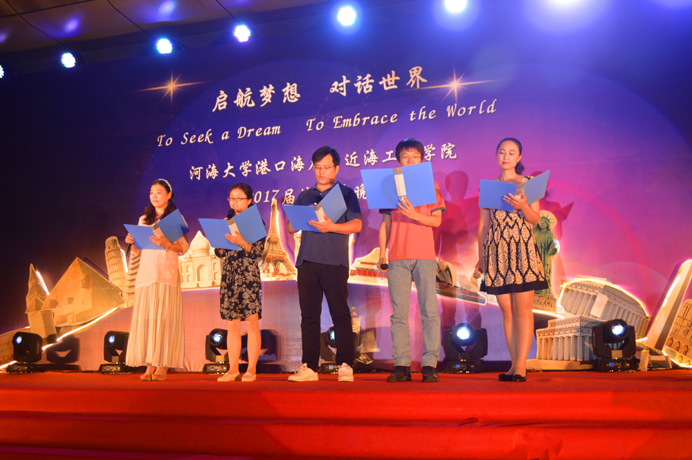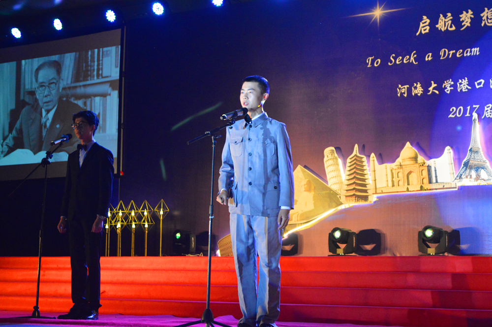 晚会的主题是“启航梦想,对话世界”,一开场,晚会的世界著名建筑物背景和主持人流利的中英双语开场顿时让整个晚会充满了国际范儿。随后,精彩的节目也让人拍手叫绝、意犹未尽。研究生们活力四射的啦啦操和曼妙的拉丁舞表演、蒋勤老师的美声独唱、本科生们的爆笑小品和精彩歌舞,以及班导师、辅导员振奋人心的诗朗诵,还有海洋学院带来的歌舞表演,这些精心准备的节目不仅展现了同学们的多才多艺,每个节目中蕴含的浓浓深情更让人动容。