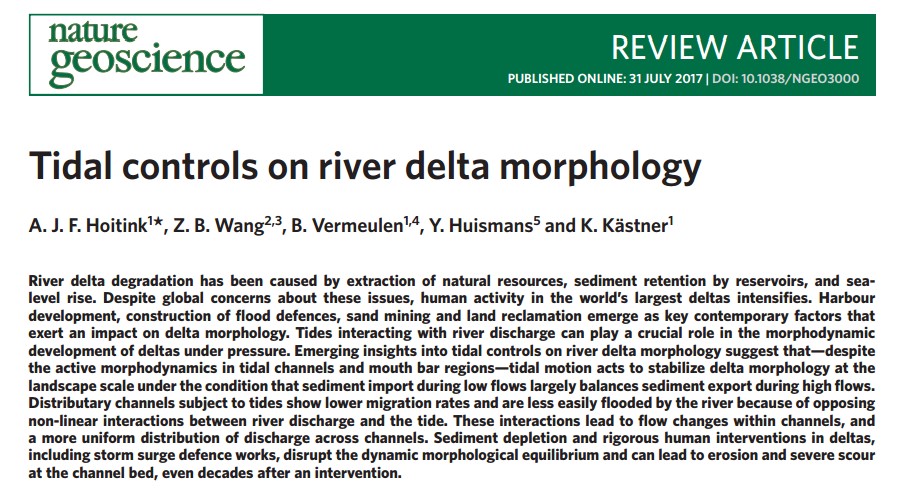 近期,博彩网 张蔚教授和周曾副研究员的学术研究成果被国际顶尖学术期刊Nature旗下子刊Nature Geoscience(影响因子13.941)上发表的论文“Tidal controls on river delta morphology”引用。该论文回顾了近年来在三角洲地貌演变研究领域起主要推动作用的研究成果,其中多出引用了张蔚教授发表在《Geomorphology》上的论文“Long-term change in tidal dynamics and its cause in the Pearl River Delta, China”和发表在《Marine Geology》上的论文“Morphological change in the Pearl River Delta, China”, 以及周曾副研究员发表在《Earth-science Reviews》上的论文“Is morphodynamic equilibrium an oxymoron?”和发表在《Journal of Geophysical Research》上的论文“A comparative study of physical and numerical modeling of tidal network ontogeny”。