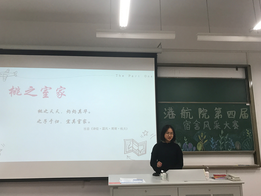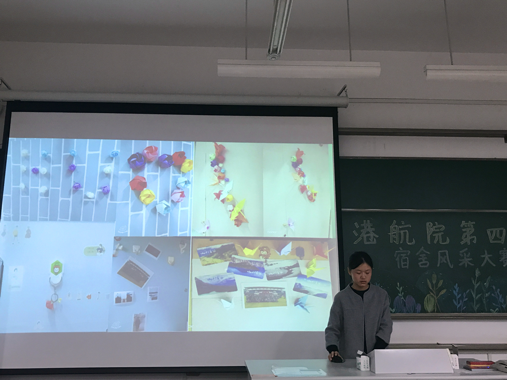 主持人致开场辞后,比赛正式开始。本次比赛共有22个宿舍参加,各宿舍代表依次上台以ppt或短视频的形式介绍本宿舍特色,现场气氛热烈,精彩讲解赢得了大家的阵阵掌声。其中,以《诗经·桃夭》篇为引的“桃之室家”宿舍特色鲜明。精美的折纸作品,清新简单的宿舍布置,干净整洁的宿舍环境,充分体现了同学们的心灵手巧,给观众们留下了深刻的印象。最后,经评委与各宿舍代表投票,选出获奖宿舍。主持人公布现场投票结果,并展示预热活动中的最佳人气宿舍照片。辅导员张同鑫老师上台为获奖宿舍颁奖并合影留念,本次比赛圆满落幕。