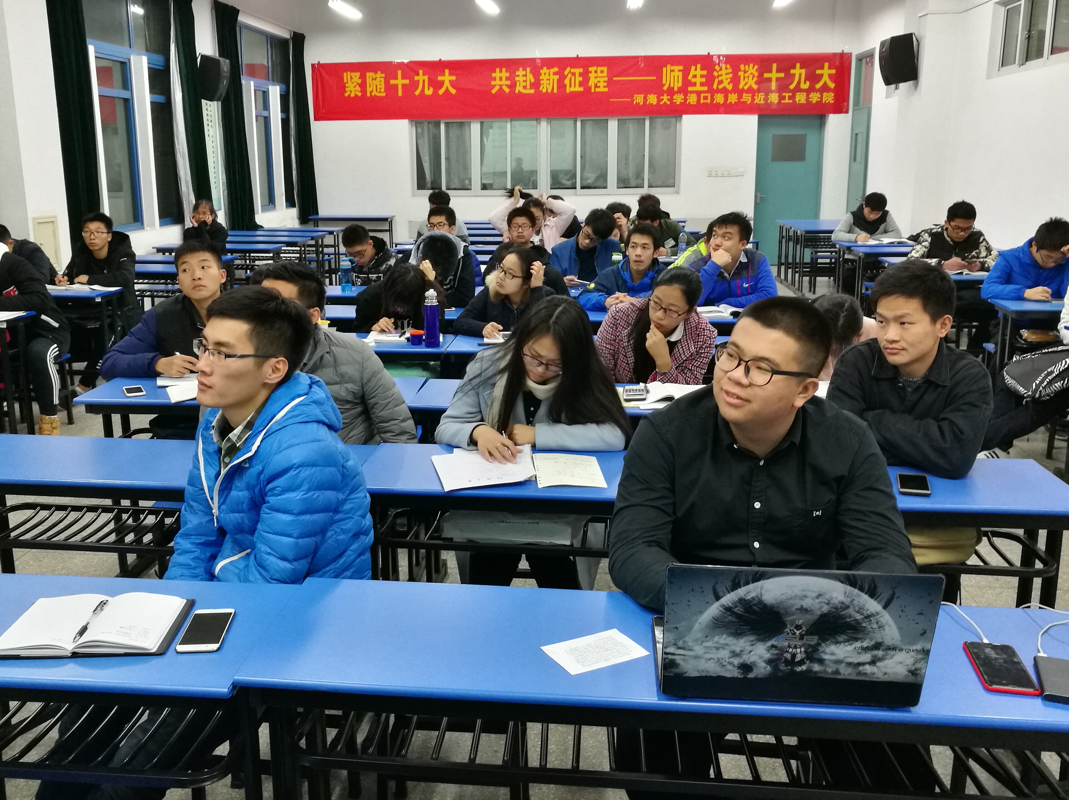 2017年11月30日晚6点30分,博彩网 2016级港航3班在江宁校区励学楼109教室举办了“紧随十九代,共赴新征程——师生浅谈十九大”交流活动。活动邀请到了博彩网 海工所陶爱峰老师,来带领同学们共同学习十九大。