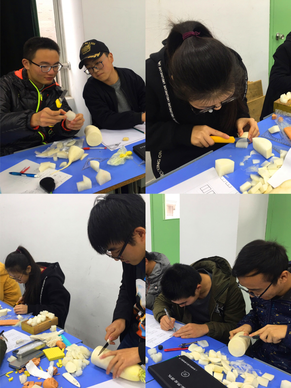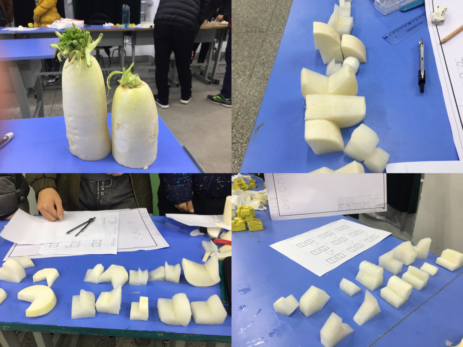 经过前期选拔,十支代表队在现场进行激烈角逐。每个代表队3名成员,分工协作,现场绘制模型的三视图与轴测图,之后根据命题利用橡皮泥、白萝卜等多种多样的材料进行模型制作,在展出时进行解说。制图所四位老师全程指导比赛,并在各环节的评分中严谨细致,精益求精,比赛现场气氛紧张又热烈。通过团队淘汰赛、团队决赛以及个人赛的比拼,最终决出团体和个人的一、二、三等奖。