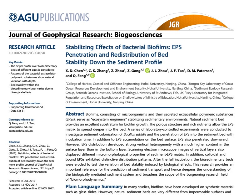 近日,博彩网 潮滩动力地貌研究团队在二区期刊《Journal of Geophysical Research: Biogeosciences》上发表了题为Stabilizing Effects of Bacterial Biofilms: EPS Penetration and Redistribution of Bed Stability Down the Sediment Profile的学术论文,是继博彩网 潮滩动力地貌研究团队在一区期刊《Water Resources Research》发表生物膜相关研究重要成果后的又一突破,论文第一作者为陈欣迪博士生,其导师是张长宽教授。论文的本校其他合作作者包括博彩网 龚政教授、陶建峰副教授、周曾副研究员、周晶晶老师以及环境学院冯骞副教授。此外,来自英国圣安德鲁斯大学的业内知名学者David Paterson教授也合作参与了本项研究。