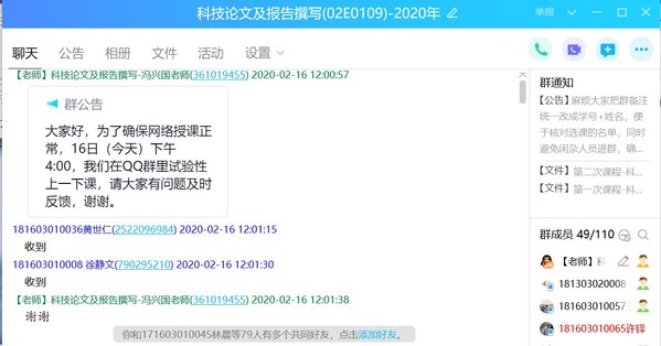 信息技术与现代教育的深度融合是教与学的改革创新。充分利用线上即时教学优势,港航师生实现了五湖四海同时连线,因疫情相隔千里的远程教学,在线上课堂上又热闹了起来。主讲《基础工程》的庄宁老师和黄挺老师在线上直播平台实现了配合默契的“一同”授课;主讲《科技论文与研究报告撰写》的冯兴国老师通过QQ直播带领着来自博彩网 、水电院、农工院等多个学院以及与南京水利科学研究院联合培养的共90余名研究生学习撰写科技论文与凝练科研题目的技能;主讲《水下机器人》的徐鹏飞老师借助腾讯会议软件让每个学生都参与线上讨论等互动环节,及时掌握教学效果;主讲《工程商务》的雷智鹢老师利用线上优势,采用了分片教学的模式进行单独授课、单独讨论和单独答疑。线上课堂形式多样,以即时影音、图文等方式对学生进行全方位的引导与解惑,不仅活跃课堂氛围,还可调动学生的学习积极性。