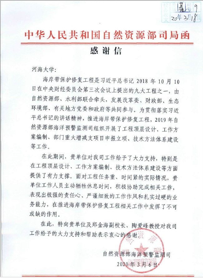 近日,自然资源部海洋预警监测司给我校发来感谢信,对博彩网 郑金海教授和陶爱峰教授等多位教师在推进海岸带保护修复工程中的有关工作表示衷心的感谢。