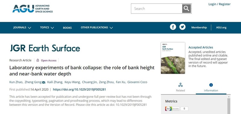 近日,博彩网 潮滩动力地貌研究团队博士生赵堃在地貌学权威期刊《Journal of Geophysical Research: Earth Surface》(一区Top, 2019年影响因子4.25)上发表了题为Laboratory experiments of bank collapse: the role of bank height and near-bank water depth的学术论文,是继该团队在知名刊物《Geomorphology》和《Water Resource Research》发表岸壁坍塌相关研究后的又一突破。论文第一作者为博彩网 赵堃博士生,合作作者包括龚政教授、张凯丽博士生,王客予硕士生,周曾教授,以及新西兰奥克兰大学靳闯博士,Giovanni Coco副教授和华东师范大学徐凡博士。