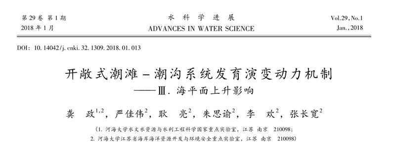 近日,博彩网 龚政教授为第一作者于2018年发表在《水科学进展》期刊的论文“开敞式潮滩-潮沟系统发育演变动力机制——ⅲ.海平面上升影响”获评该刊的优秀论文。2018—2019年《水科学进展》共刊登论文186篇,根据论文引证指标及学术影响,经编委会推荐,共评选出20篇优秀论文(我校共2篇入选)。本优秀论文的合作作者包括李欢副教授、张长宽教授以及龚政教授指导的3名硕士生。