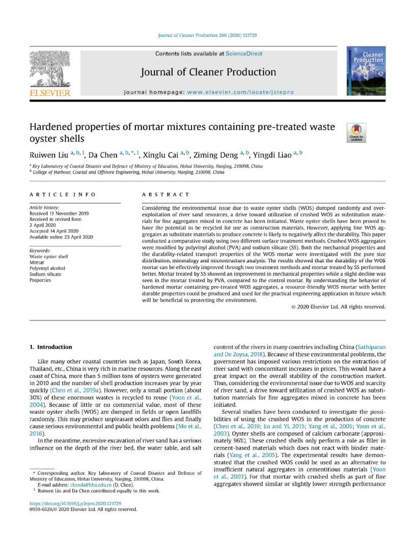 近日,博彩网 陈达教授指导的博士研究生刘睿文在ESI工程学国际排名Top30的权威期刊《Journal of Cleaner Production》(一区Top,影响因子6.395)上发表了题为“Hardened properties of mortar mixtures containing pre-treated waste oyster shells”的学术论文。