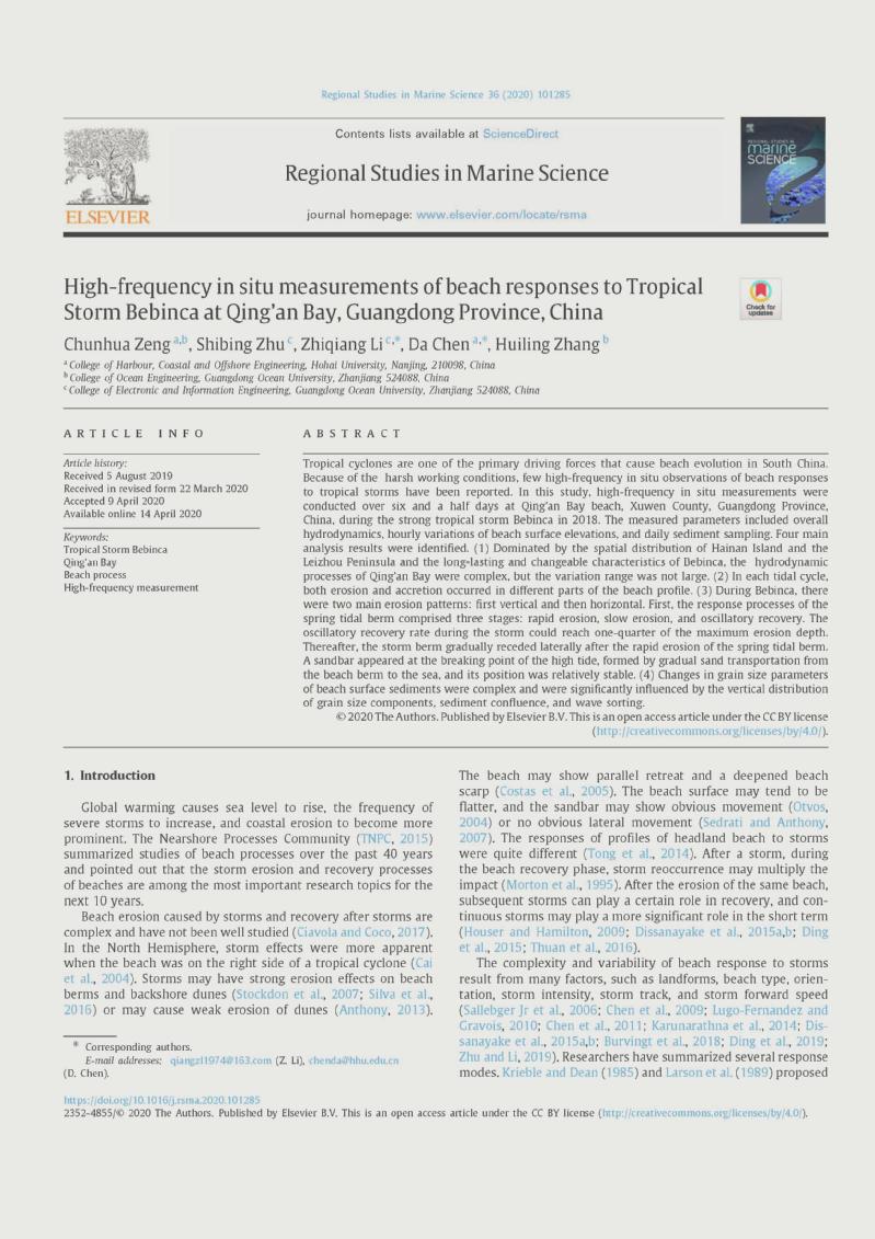 近日,博彩网 陈达教授指导的博士研究生曾春华在《Regional Studies in Marine Science》(二区)上发表了题为“High-frequency in situ measurements of beach responses to Tropical Storm Bebinca at Qing’an Bay, Guangdong Province, China”的学术论文。