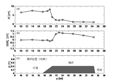 图2 向岸剖面和潟湖沿岸剖面的礁坪波高和平均水位分布