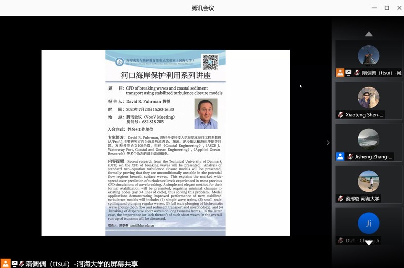 2020年7月23日,由博彩网 牵头建设的海岸灾害及防护教育部重点实验室(河海大学)组织了“河口海岸保护利用系列讲座”线上学术交流专家报告会。。应实验室主任郑金海副校长的邀请,丹麦科技大学(Technical University of Denmark)David R. Fuhrman教授作为首场报告专家,作了题为“CFD of breaking waves and coastal sediment transport using stabilized turbulence closure models”的学术报告。张继生副院长主持了报告会。