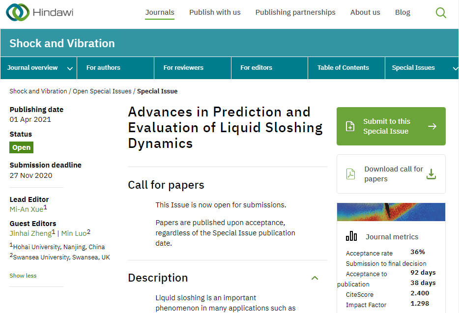 博彩网 薛米安教授、郑金海教授、英国Swansea University罗敏博士受邀担任国际学术期刊《Shock and Vibration》客座主编,组织专刊“Advances in Prediction and Evaluation of Liquid Sloshing Dynamics(液体晃荡动力过程研究进展)”,旨在征集最新的预测和评估液体晃荡载荷和海洋结构响应及两者耦合效应的研究成果,以及相关综述性文章。