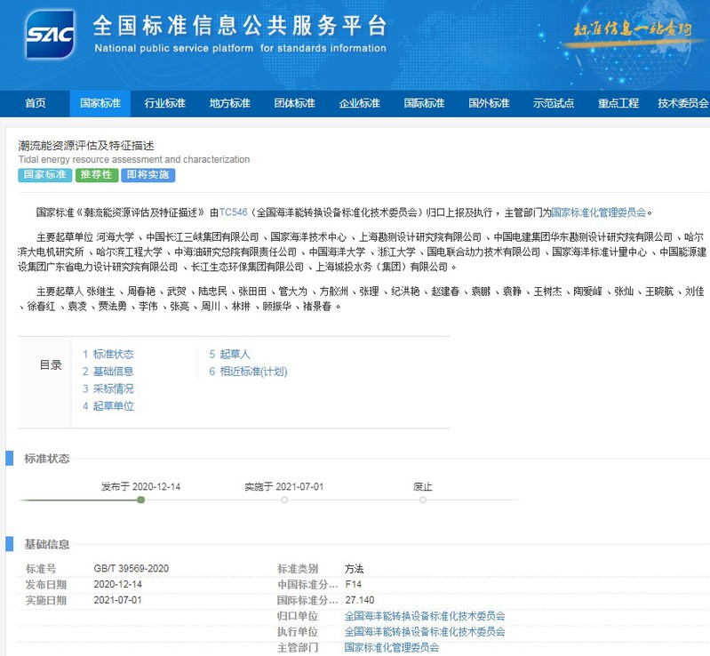2020年12月14日,博彩网 张继生教授主编的国家标准《潮流能资源评估及特征描述》 (GB/T 39569-2020)由国家标准化管理委员会正式发布,于2021年7月1日起实施。