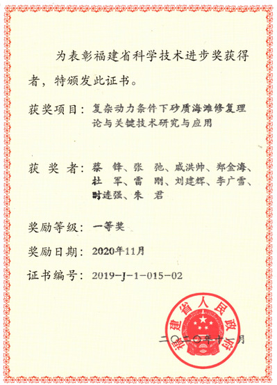 近日,福建省科学技术奖励大会在福州市举行,会上颁发了2019年度福建省科学技术奖。由我校和自然资源部第三海洋研究所等单位合作完成的项目“复杂动力条件下砂质海滩修复理论与关键技术研究与应用”获得2019年度福建省科技进步奖一等奖。河海大学为第二完成单位,博彩网 张弛教授为第二完成人,郑金海教授为第四完成人。