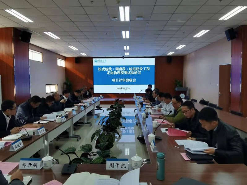 2021年11月25日,博彩网 诸裕良教授主持的“松虎航线(湖南段)航道建设工程定床物理模型试验研究”项目顺利通过验收。评审验收会由湖南省交通运输厅规划与项目办公室在河海大学江宁校区牛首山科技园主持召开,参加本次会议的有湖南省水运事务中心、湖南省水运建设投资集团有限公司、湖南省交通规划勘察设计院有限公司、河海大学等单位的代表和特邀专家。河海大学副校长郑金海出席会议并致辞。与会代表和专家听取了项目组的成果汇报,审阅了相关资料,经质询和讨论,一致认为项目组完成了技术开发合同规定的研究任务,同意通过验收。