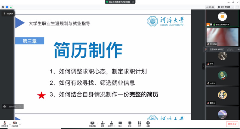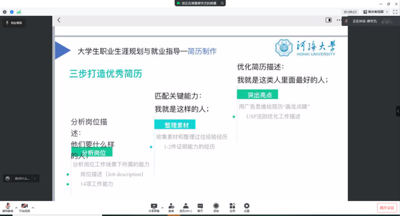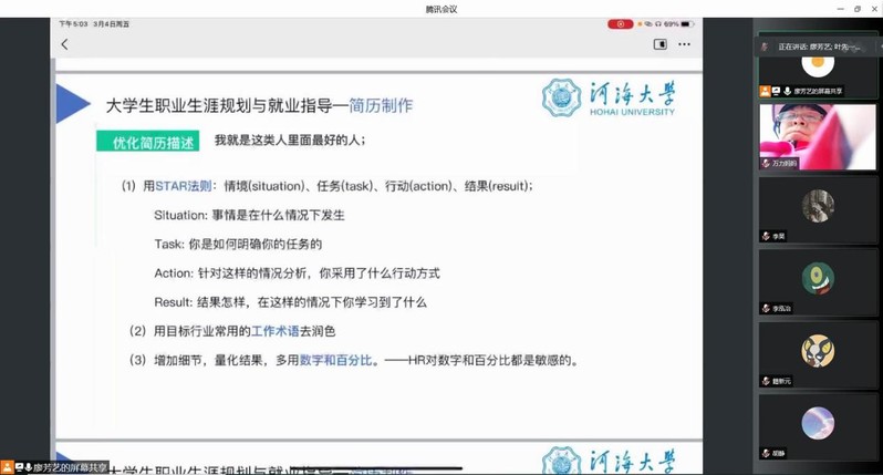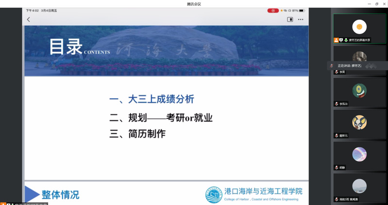 2022年3月4日下午,博彩网 2019级在线上开展职业生涯规划和简历制作培训会。大会由2019级本科生辅导员廖芳艺主持,2019级全体学生及家长参加本次大会。廖芳艺老师就年级整体学习情况、大三学年生涯规划、简历制作培训进行分享。