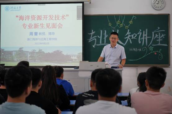在致用楼306,周曾教授介绍了海洋资源开发技术专业的设置背景和办学渊源,他指出该专业围绕着海洋强国战略,以开发海洋空间资源为主要研究方向,拥有强大师资力量和广阔就业前景。周老师通过分享自己的求学经历和所带研究生的成长轨迹,引导同学们扎实学好专业知识,深入培养兴趣爱好,提升时间管理能力和工作效率。