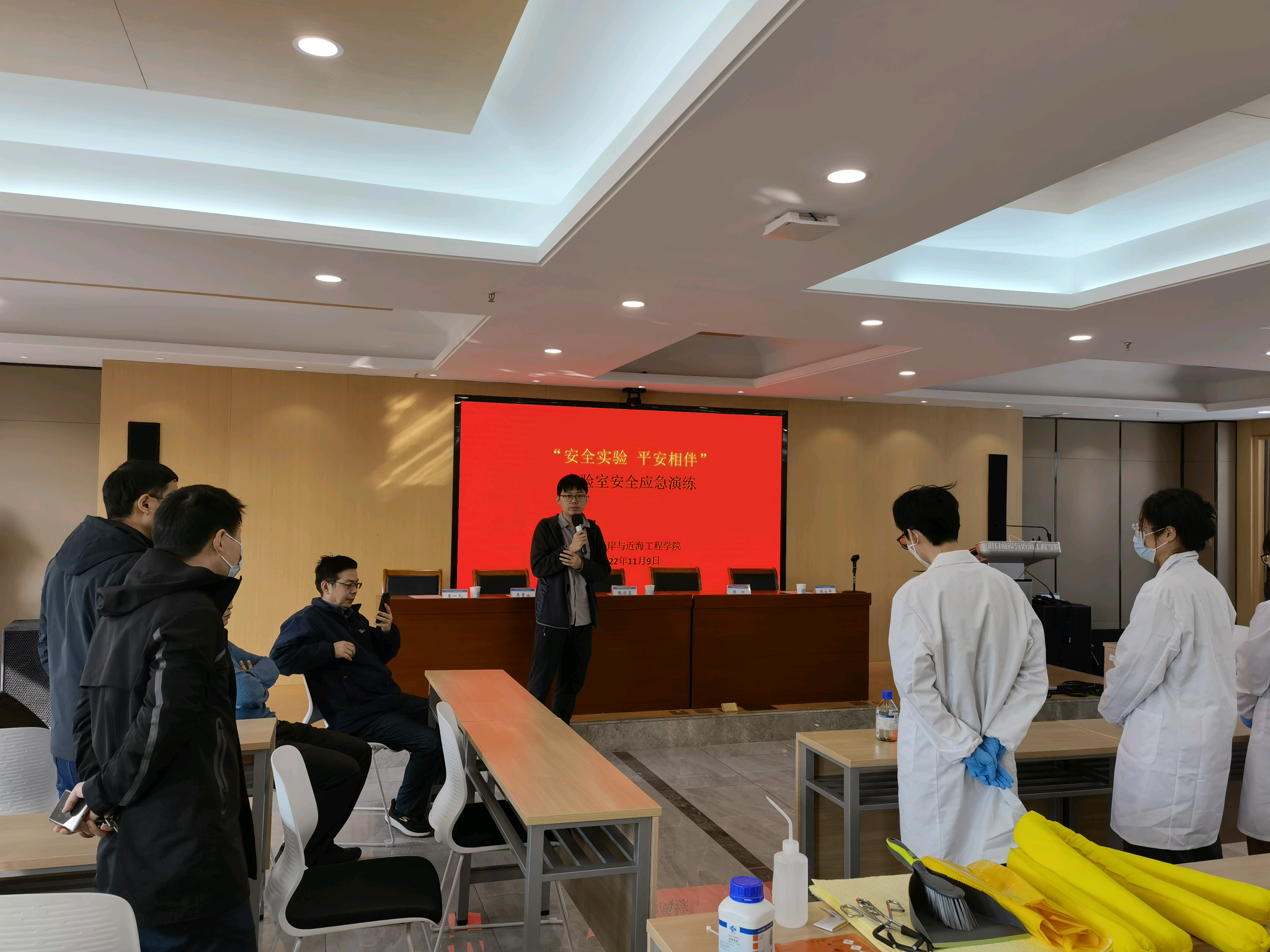 11月9日,博彩网 在严恺馆702会议室召开实验室安全应急演练会议。会议由学院陈永平副院长主持,学院党委书记张俊基、学校保卫处副处长吴青山、资产与实验室管理处副处长陈红、埃德博格公司经理李一凡出席会议,学院相关实验室管理人员、涉化实验室教师及学生参加。