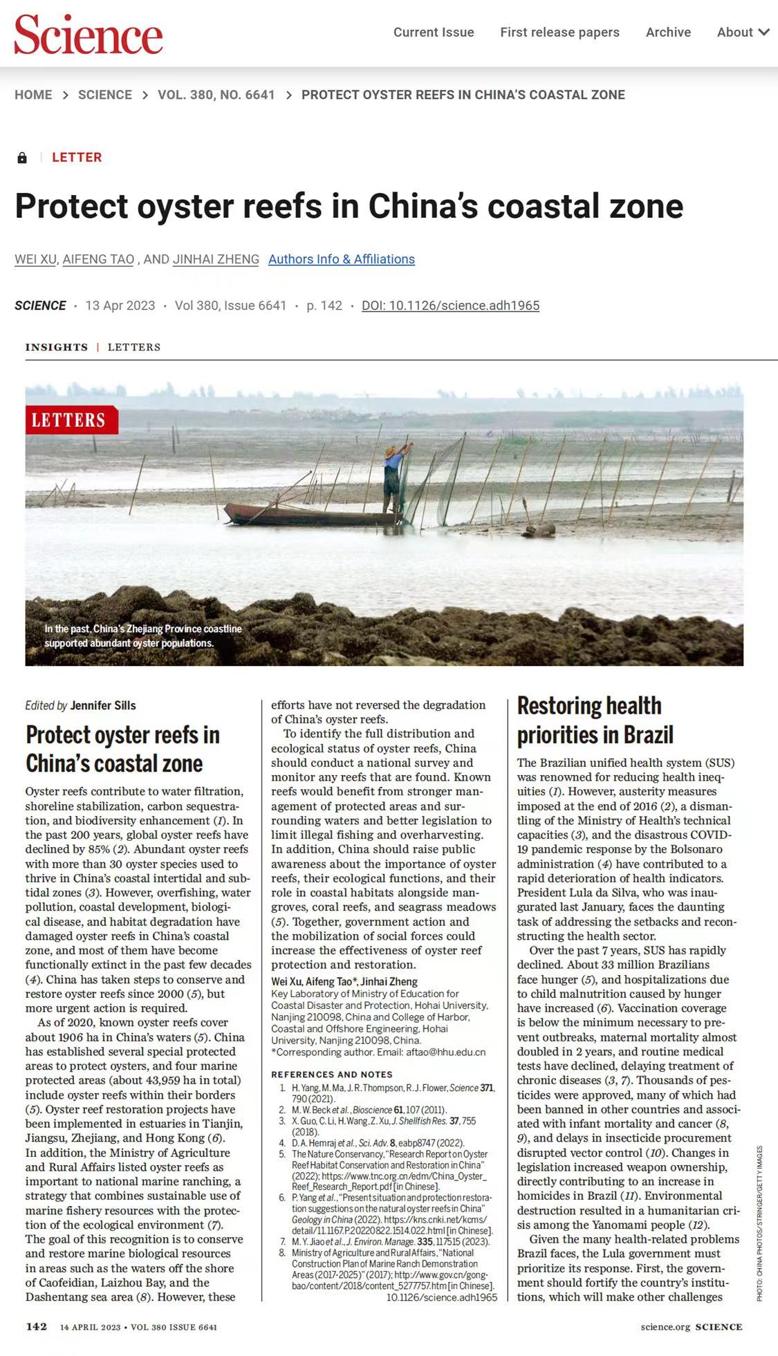 近日,博彩网 河口海岸综合治理和保护研究团队在国际期刊《Science》上发表题为“Protect oyster reefs in China’s coastal zone”(图1)的LETTER,总结我国牡蛎礁海岸修复措施,呼吁进一步加强保护。团队博士生徐伟为第一作者、骨干陶爱峰教授为通讯作者、负责人郑金海教授为共同作者。