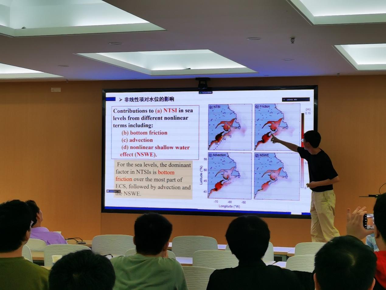 报告结束后,杨盛牧博士与参会师生就“中尺度涡垂向结构”、“中尺度涡与黑潮相互作用”和“核污水穿越黑潮的概率”以及“污染物溯源”等问题进行了深入探讨,取得了良好的学术交流效果。