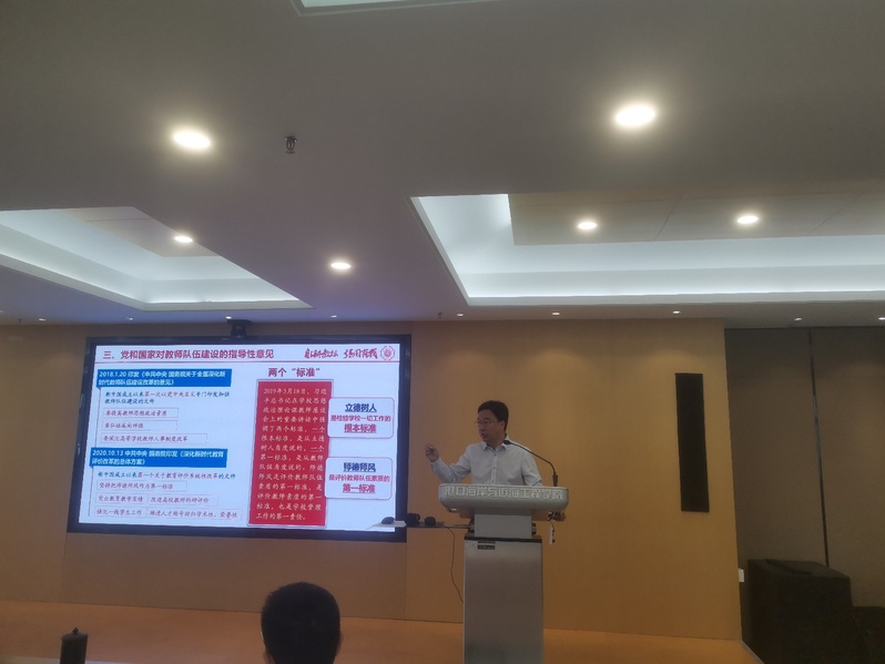 张雪刚书记带领学院教师学习教师思想政治和师德师风建设的总体要求和新时代高校教师行为规范,提出教育家应有心有大我、至诚报国的理想信念,言为士则、行为世范的道德情操,启智润心、因材施教的育人智慧,勤学笃行、求是创新的躬耕态度,乐教爱生、甘于奉献的仁爱之心,胸怀天下、以文化人的弘道追求。为起到警示教育,张雪刚书记深入浅出地为大家阐述了一批违反“十项准则”的典型案例,以案肃纪,以案说法,强调应时刻敲响师德警钟,不断提高教师职业道德素养。