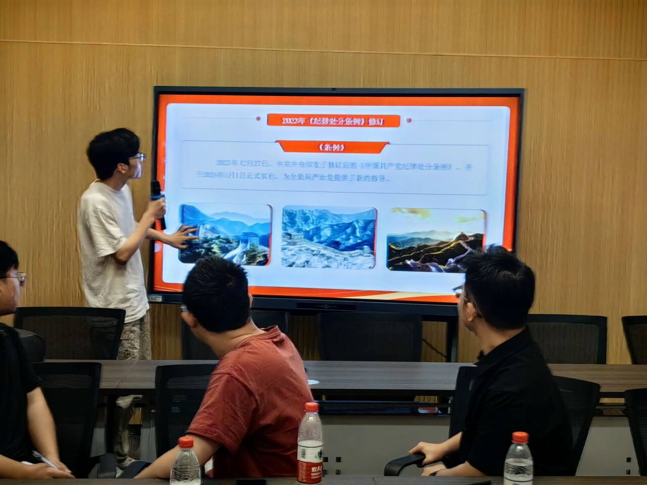 支部纪检委员袁其伟领学《中国共产党记录处分条例》,深入解读党纪条例的精神内涵和具体要求。龚政院长结合自身经验和实践,进一步指明党纪条例的重要性和实施意义,引导支部成员深入思考和探讨如何在日常工作和学习中遵守党纪党规,增强党员的政治意识和纪律观念。通过共同学习和交流,支部成员对党纪条例的内容和要求有了更加清晰的认识,为更好地践行党纪精神奠定了坚实的基础。
