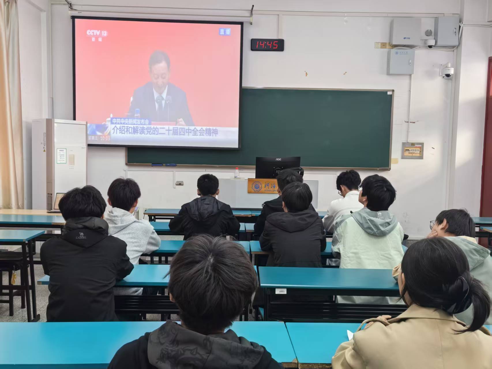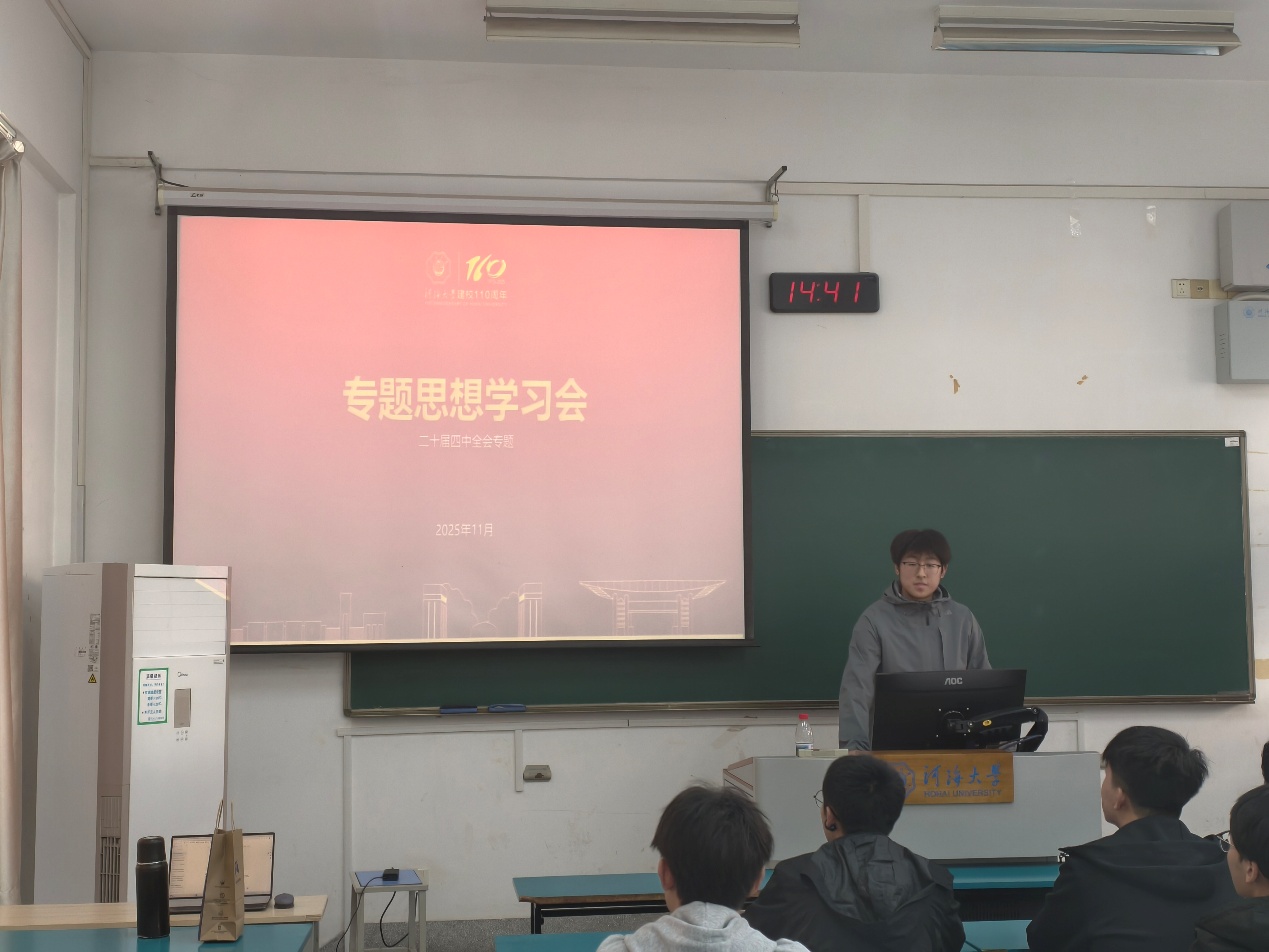 会议第二部分,组织学习二十届四中全会会议精神。主持人首先对全会基本信息作了介绍,指出我党凝聚同心,绘制未来蓝图,此次全会起到承上启下的重要作用,同时会议总结了推进中国式现代化的六个“坚持”。随后,全体同学观看了二十届四中全会相关视频,更加深入地了解了此次全会的重要意义和深远影响。