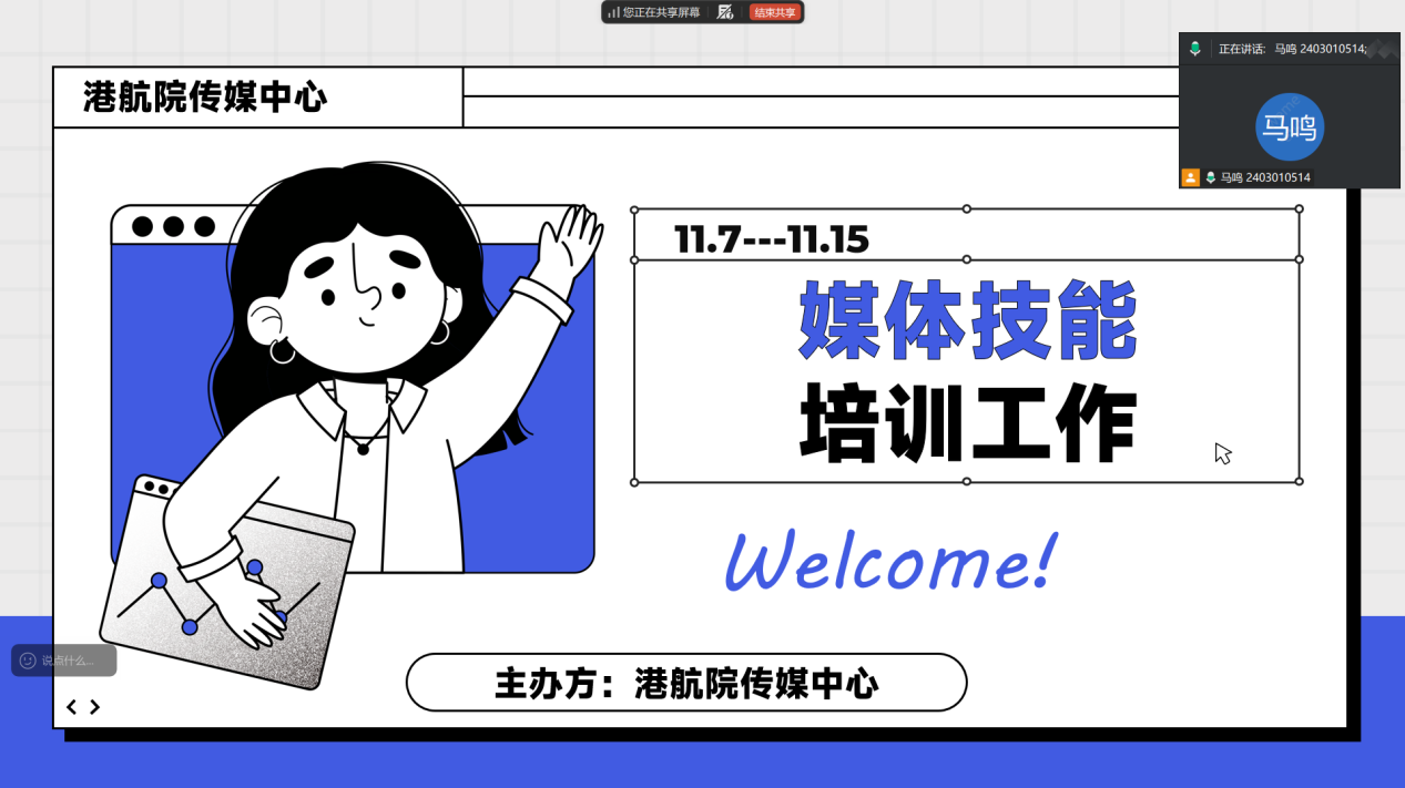 为全面提升学生运用新媒体工具的能力,11月7日到11月15日,博彩网 传媒中心面向学院本科生,聚焦视频剪辑、平面设计及公众号运营等实用技能,开展了以“新媒体技能培训”为主题的线上专项培训。