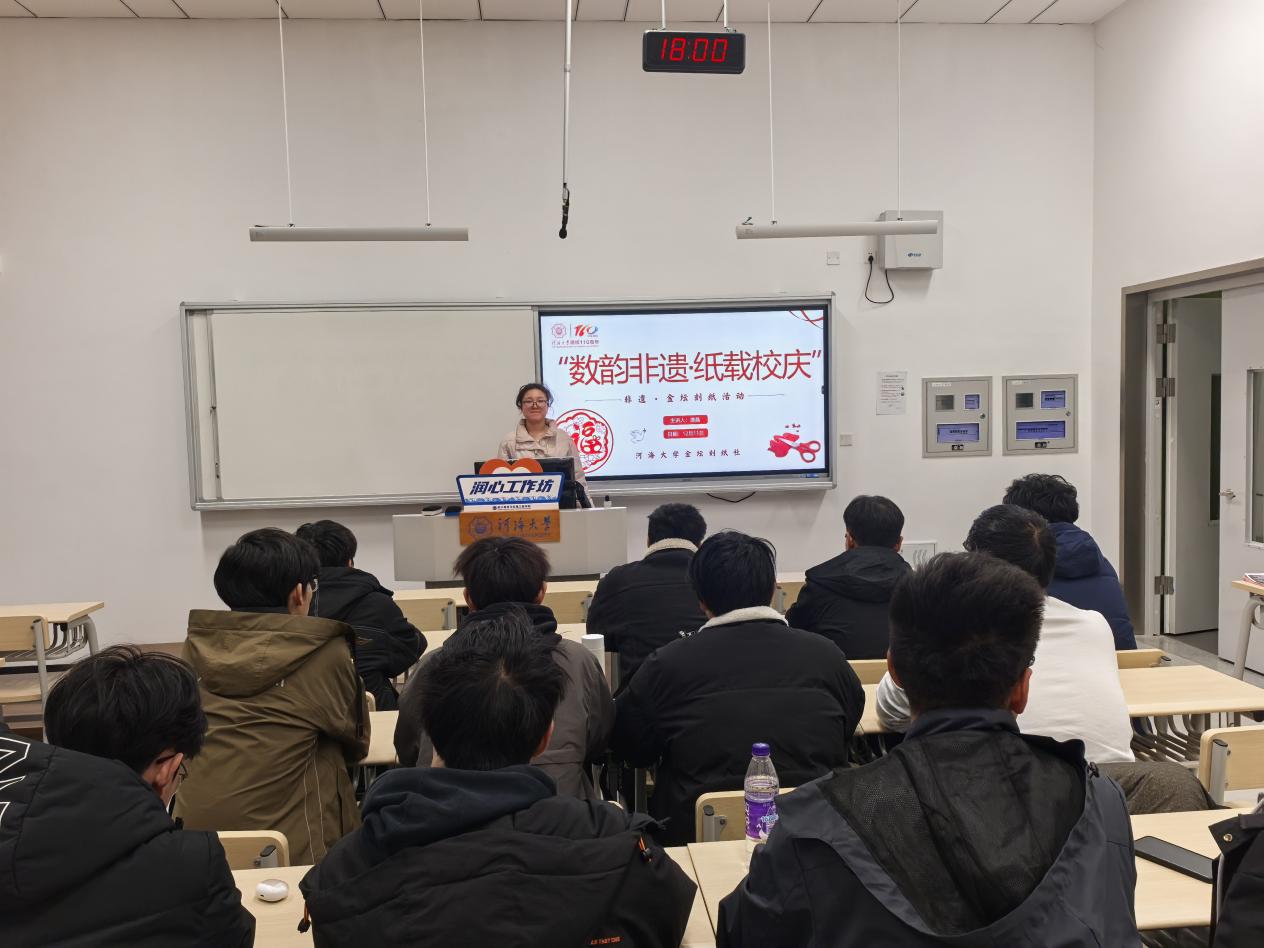 本次活动以“数韵非遗,纸载校庆”为核心主题,融合非遗传承与校庆情怀。活动伊始,金坛刻纸社唐晶同学作为主讲人,介绍了金坛刻纸的非遗历史渊源,重点拆解了手工绘画(精准勾勒、兼顾美感与寓意)和镂空雕刻(含阴刻、阳刻等刀法)两大核心工艺。现场通过展示社团过往作品照片,涵盖校园、校庆元素创作,直观展现刻纸艺术魅力,点燃了同学们的实践热情。