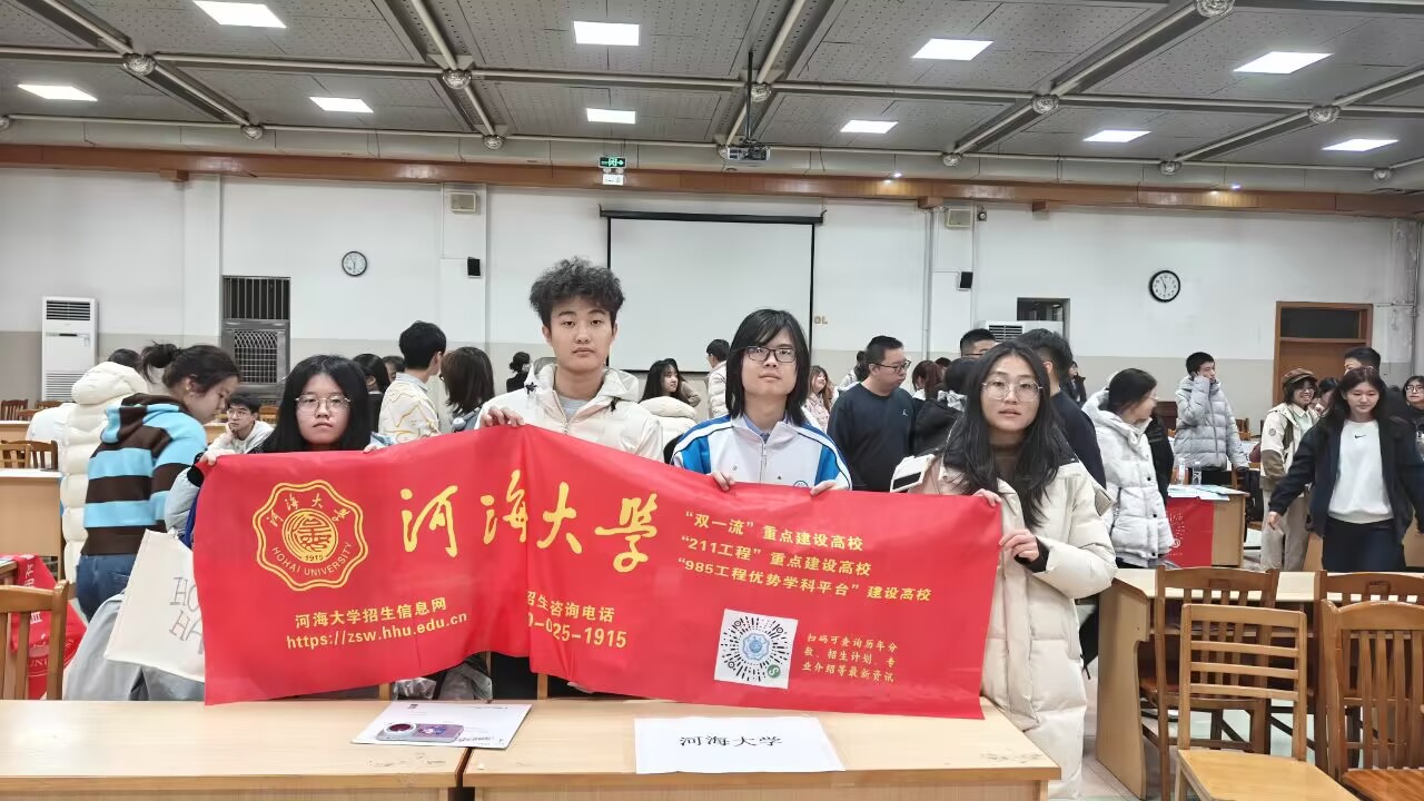 在学校体育馆举办的全国大学节活动中,来自全国各地的高校咨询台一字排开。澄澜载毅队成员身披河海大学宣传绶带,通过宣传手册、校园文创和精彩视频,向驻足咨询的学子全面介绍学校历史沿革、学科优势与校园文化。面对 “水利工程专业特色”“录取政策”“大学生活适应” 等疑问,队员们结合自身经历耐心解答,现场互动氛围热烈,让双十学子直观感受河海 “艰苦朴素,实事求是,严格要求,勇于探索” 的校训精神。